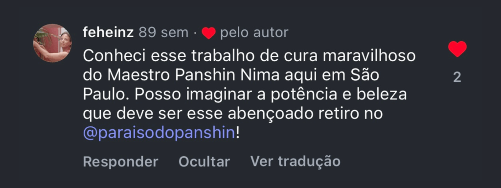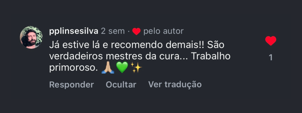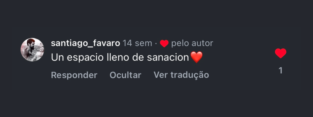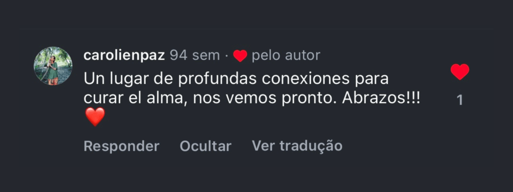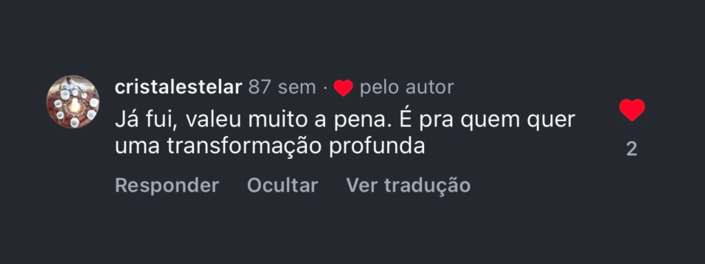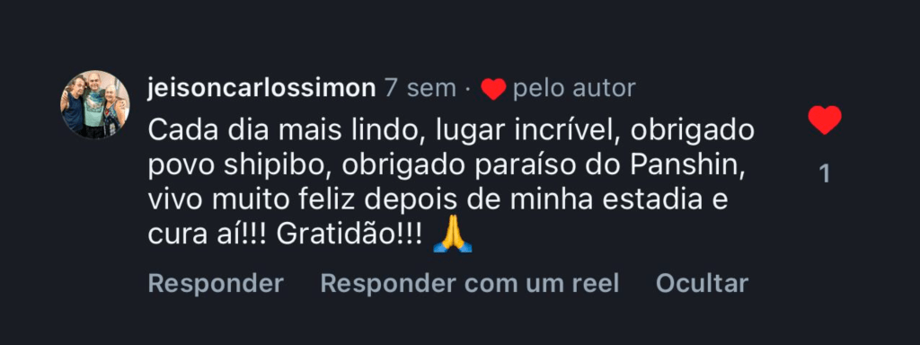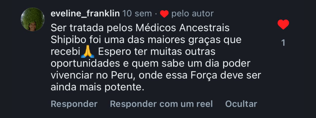 “Quando o Shipibo acendeu o mapacho e assoprou na minha cabeça, a sensação de completude veio imediatamente. Senti uma força materna entrar pelo topo da minha cabeça e preencher meu corpo. Essa energia me fez sentir, no útero, um acolhimento materno tão profundo e intenso que permaneci por horas em estado de êxtase. Foi uma sensação de preenchimento que permanece até hoje.