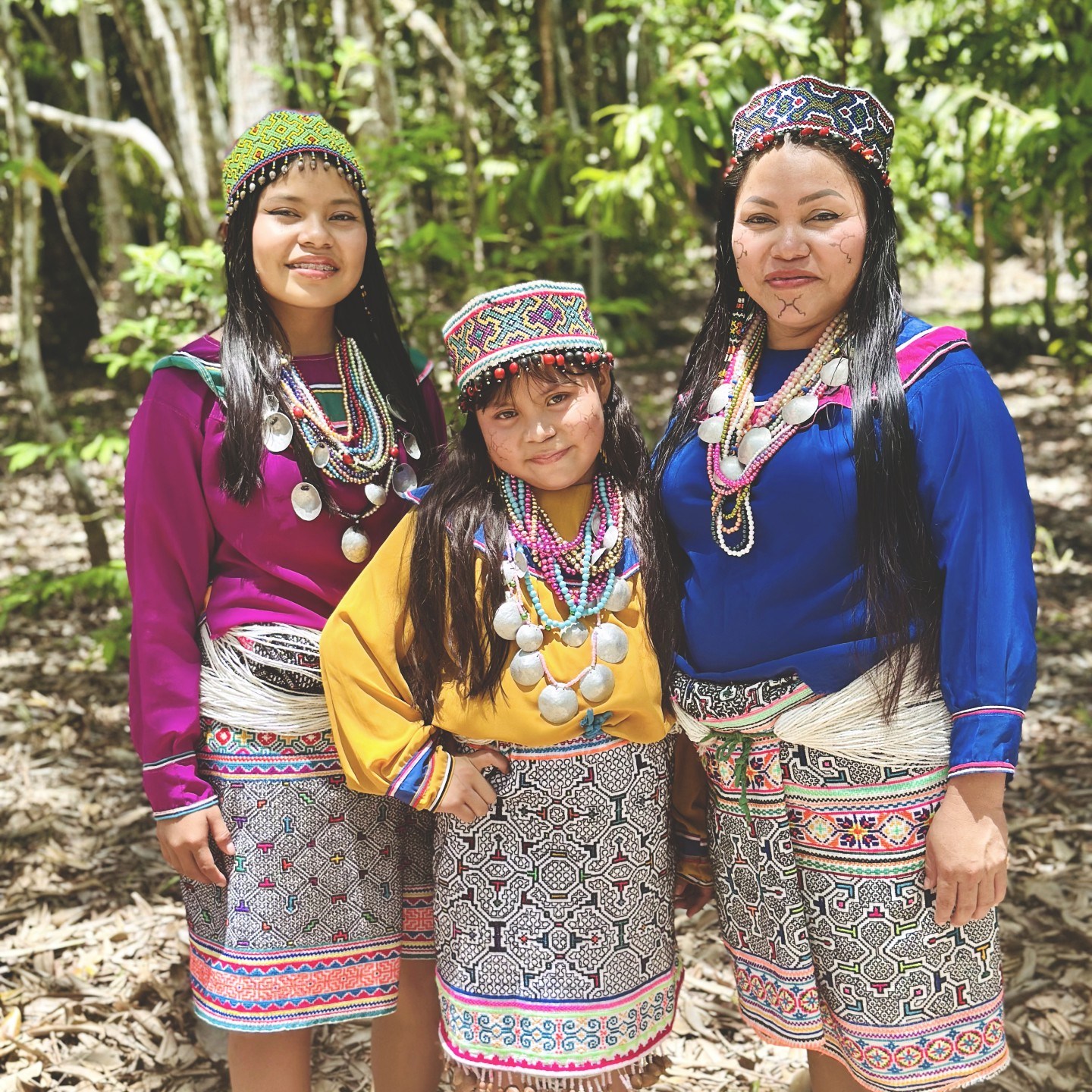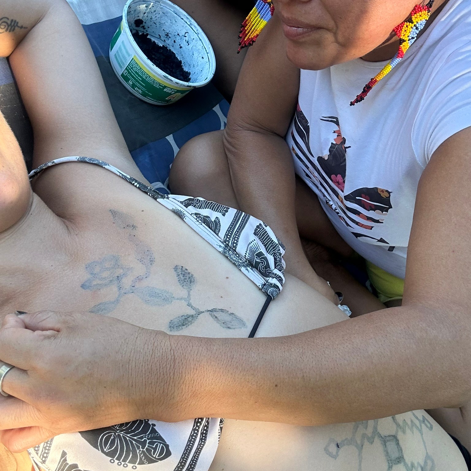 Já os kenés são padrões geométricos desenhados com traços contínuos e repetitivos que representam essas mesmas frequências em forma visual. As mulheres Shipibo-Konibo são tradicionalmente as portadoras desse conhecimento, transmitido de geração em geração. Ao bordar, pintar ou tatuar os kené, elas não apenas decoram, mas invocam, registram e conduzem forças espirituais — os desenhos são mapas do mundo invisível.